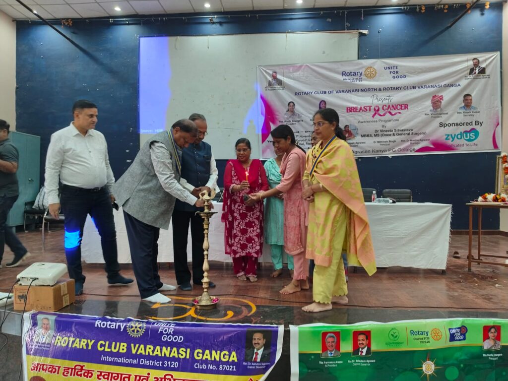 वाराणसी। राष्ट्रीय कैंसर जागरूकता दिवस के अवसर पर रोटी क्लब ऑफ वाराणसी नार्थ एवं रोटरी क्लब वाराणसी गंगा के संयुक्त तत्वावधान में श्री अग्रसेन कन्या पीजी कॉलेज, बुलानाला में जागरूकता गोष्ठी का आयोजन किया गया। कार्यक्रम की शुरुआत मां सरस्वती की प्रतिमा पर माल्यार्पण एवं दीप प्रज्वलन के
