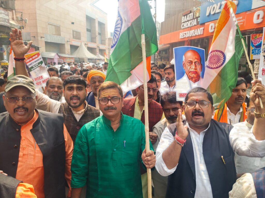 वाराणसी । वाराणसीशहर दक्षिणी विधानसभा क्षेत्र में लौह पुरुष सरदार वल्लभभाई पटेल की 150वीं जयंती पर मंगलवार को विधायक डॉ. नीलकंठ तिवारी के नेतृत्व में सनातन धर्म इंटर कॉलेज से भव्य एकता यात्रा निकाली गई। यात्रा गोदौलिया, चौक, मैदागिन और दारानगर होते हुए डीएवी डिग्री कॉलेज परिसर में संपन्न हुई, जहां सभा का आयोजन हुआ।सभास्थल पर मुख्य अतिथि के रूप में पूर्व केंद्रीय मंत्री डॉ. महेंद्रनाथ पांडेय मौजूद रहे। उन्होंने कहा कि सरदार पटेल ने गृह मंत्री रहते हुए देश की एकता को मजबूत करने का कार्य किया और वे भारत की एकता के महानायक हैं। विधायक डॉ. तिवारी ने कहा कि आज़ादी के समय जब भारत को विभाजित करने की साजिशें रची जा रही थीं, तब सरदार पटेल ने उसे एक सूत्र में बांधा। उनके ‘एक भारत, श्रेष्ठ भारत’ के स्वप्न को आज मोदी और योगी सरकार साकार कर रही है।एकता यात्रा में स्कूली बच्चों और कार्यकर्ताओं ने तिरंगे झंडों के साथ ‘एक भारत, श्रेष्ठ भारत’ और ‘एकता का संदेश–पटेल का विश्वास’ जैसे नारे लगाए। रास्तेभर चौक, गोदौलिया, मैदागिन आदि स्थानों पर व्यापार मंडलों और स्थानीय संगठनों ने पुष्प वर्षा कर यात्रा का स्वागत किया।यात्रा और सभा में महानगर अध्यक्ष प्रदीप अग्रहरि, डॉ. अजीत सिंह, अशोक जाटव, साधना वेदांती, आत्मा विशेश्वर, नीरज जायसवाल, दिलीप साहनी, राजीव सिंह, तारकेश्वर गुप्ता, बबलू सेठ, डॉ. पवन शुक्ला समेत हजारों कार्यकर्ता मौजूद रहे। कार्यक्रम का संचालन महानगर उपाध्यक्ष डॉ. आलोक श्रीवास्तव ने किया।
